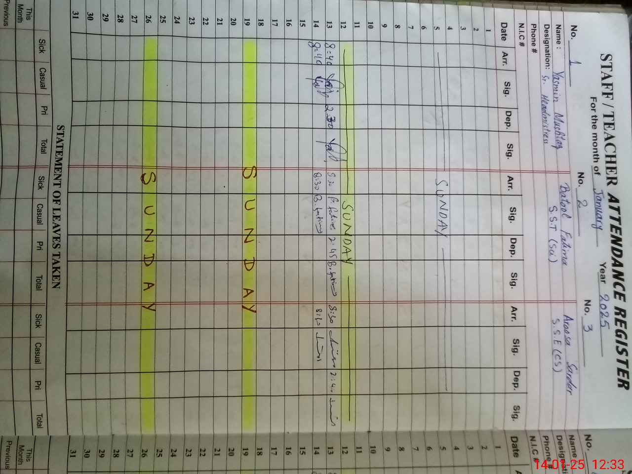 | CNIC | Full Name | Designation | R/C | Absence During Last Calender Month |