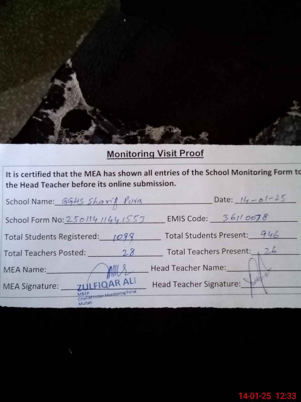 | Attendance Register | Head Teacher | MEA with School | Visit Proof |