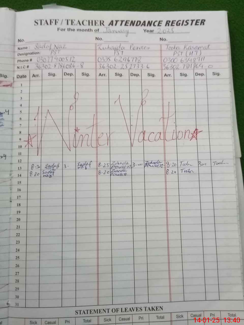 | CNIC | Full Name | Designation | R/C | Absence During Last Calender Month |