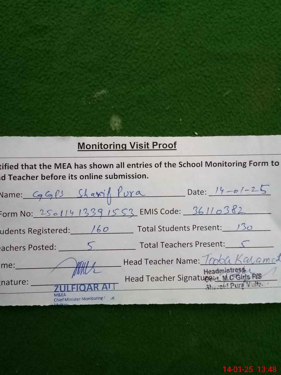 | Attendance Register | Head Teacher | MEA with School | Visit Proof |