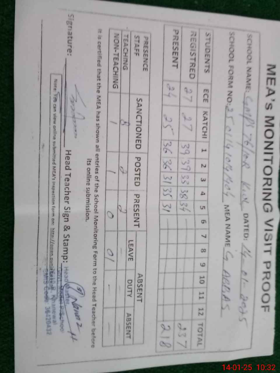 | Attendance Register | Head Teacher | MEA with School | Visit Proof |