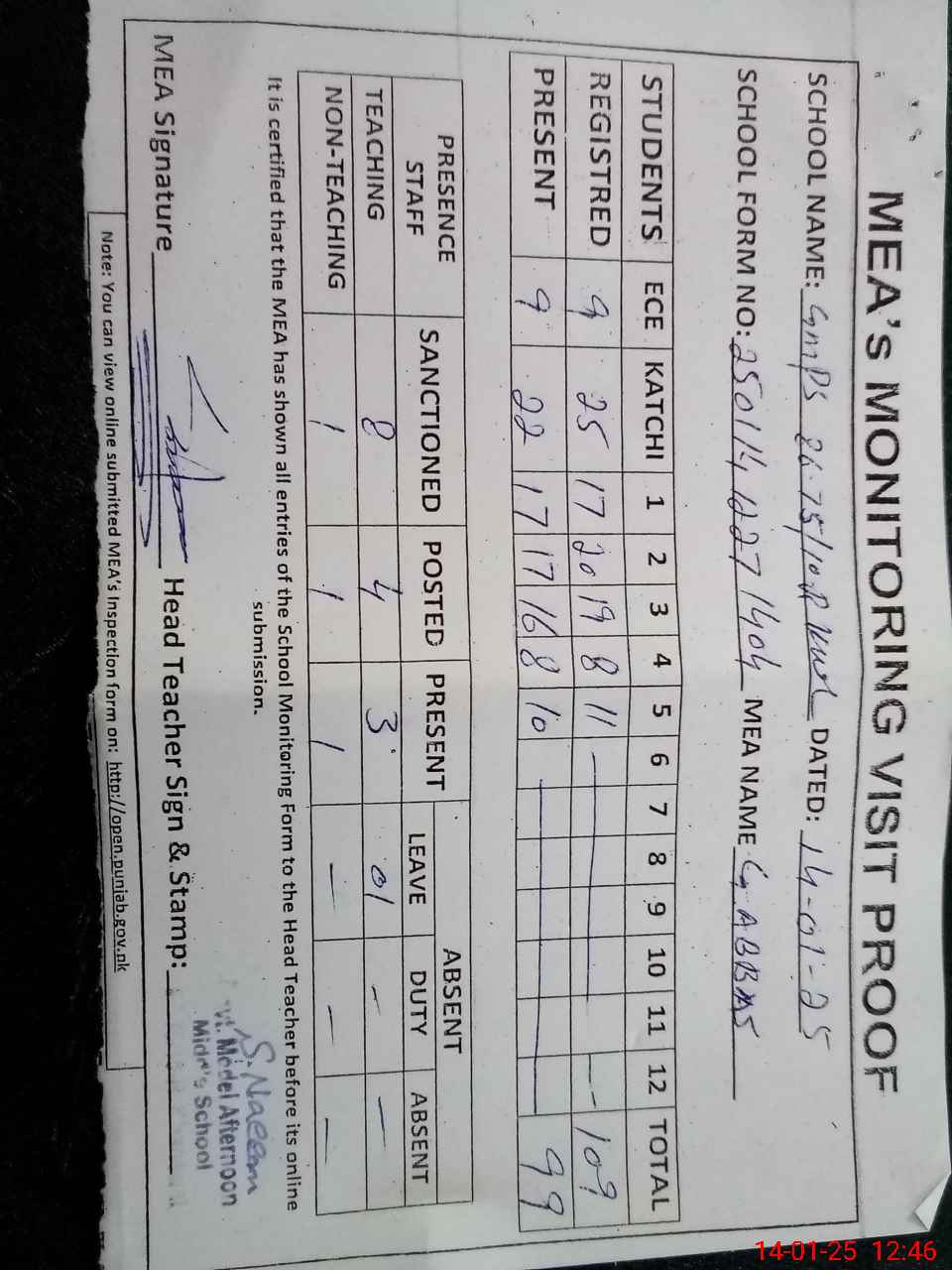 | Certified that this School was Inspected by the Undersigned MEA/DMO Today and the Information Stated Above is as Per Record. | |||||