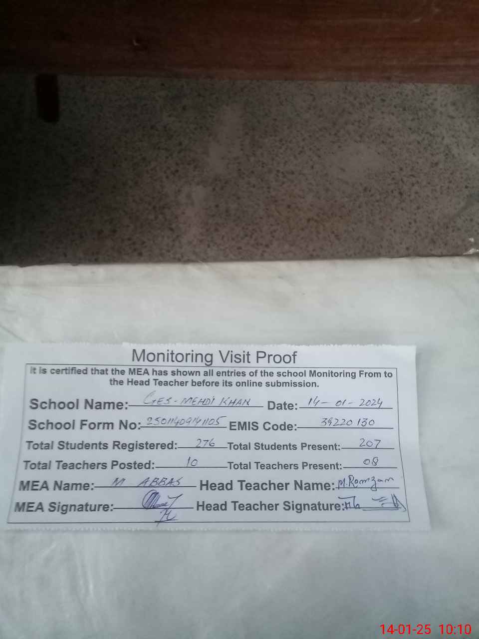 | Attendance Register | Head Teacher | MEA with School | Visit Proof |