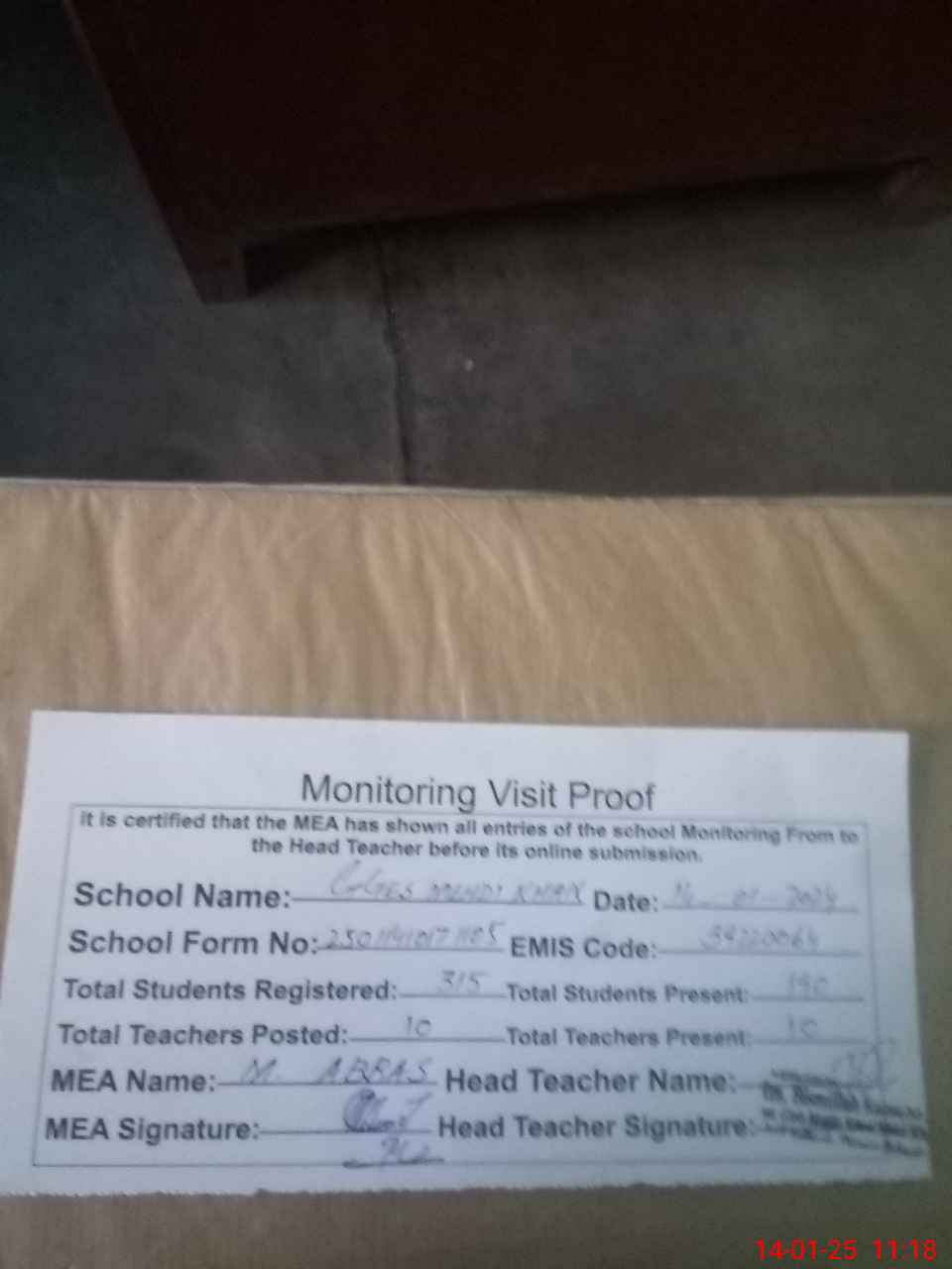 | Attendance Register | Head Teacher | MEA with School | Visit Proof |