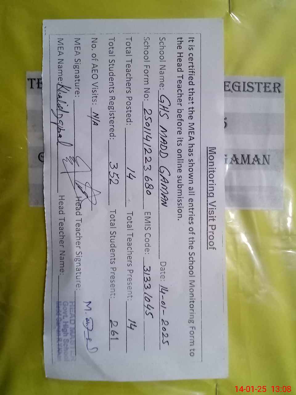 | Attendance Register | Head Teacher | MEA with School | Visit Proof |