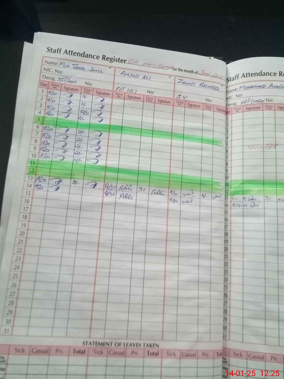 | CNIC | Full Name | Designation | R/C | Absence During Last Calender Month |