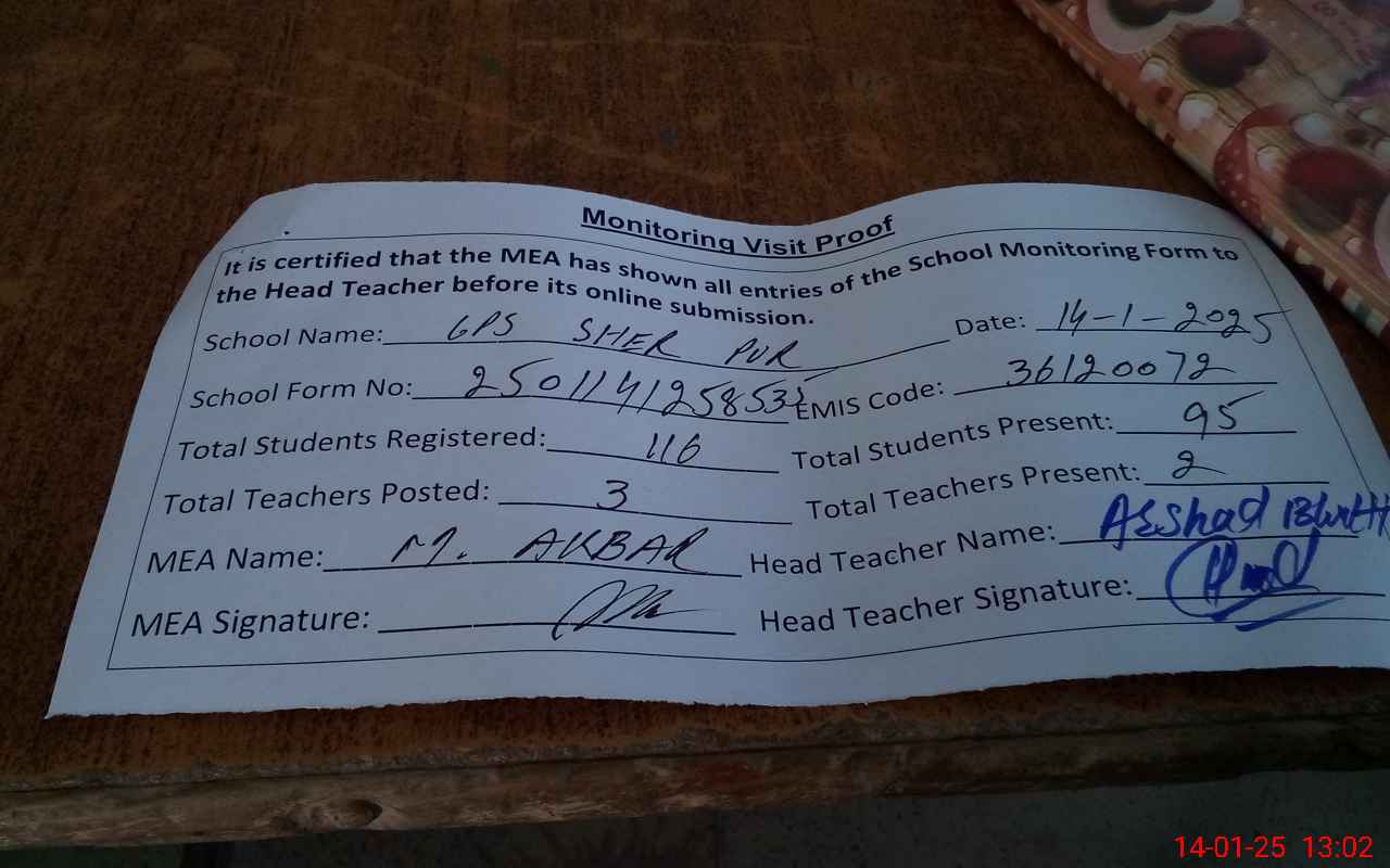| EMIS Code: 36120072 | Name of School: GPS SHER PUR P/O & TEH SHUJABAD | |||
