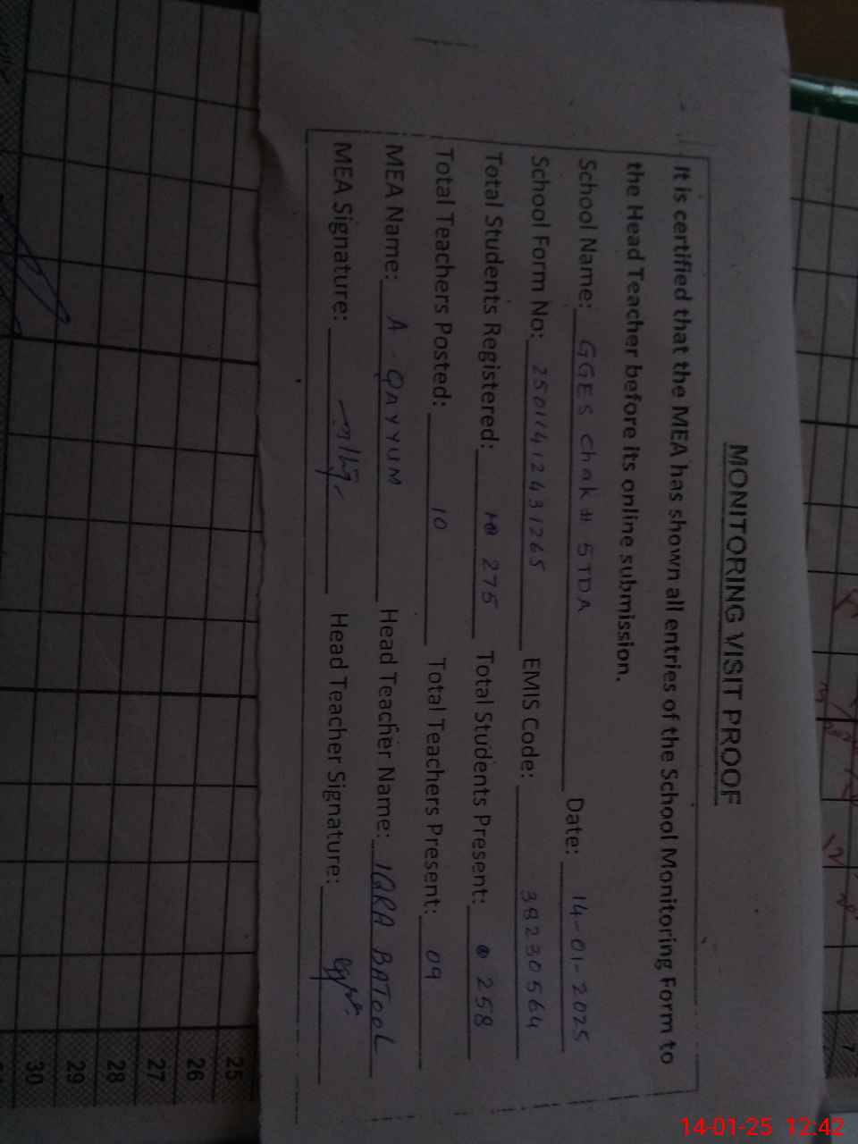 | Attendance Register | Head Teacher | MEA with School | Visit Proof |