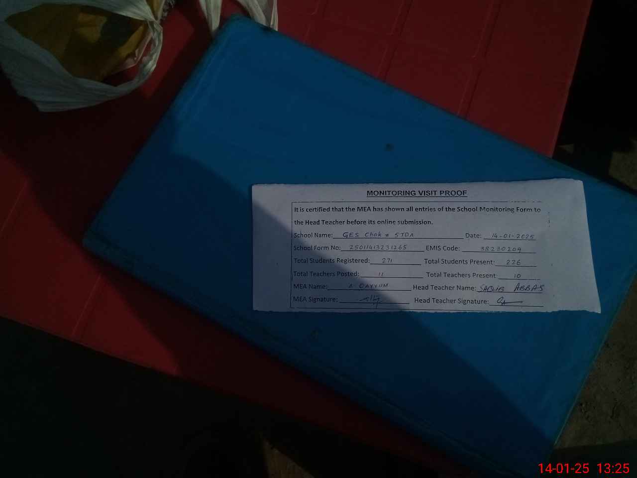 | Attendance Register | Head Teacher | MEA with School | Visit Proof |
