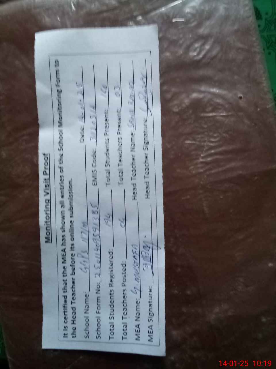 | Attendance Register | Head Teacher | MEA with School | Visit Proof |