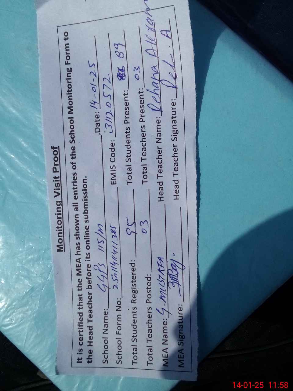| Attendance Register | Head Teacher | MEA with School | Visit Proof |