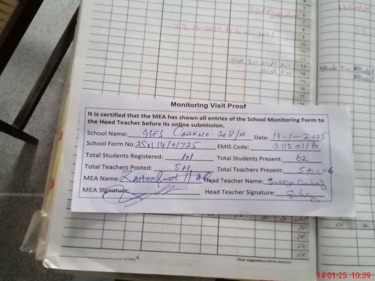 | EMIS Code: 31120116 | Name of School: GGES CHAK NO. 208 M | |||