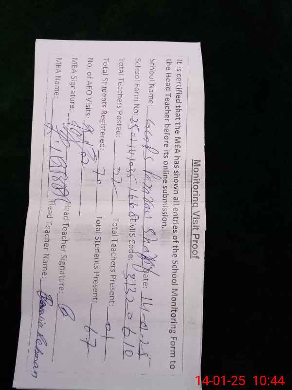 | Attendance Register | Head Teacher | MEA with School | Visit Proof |