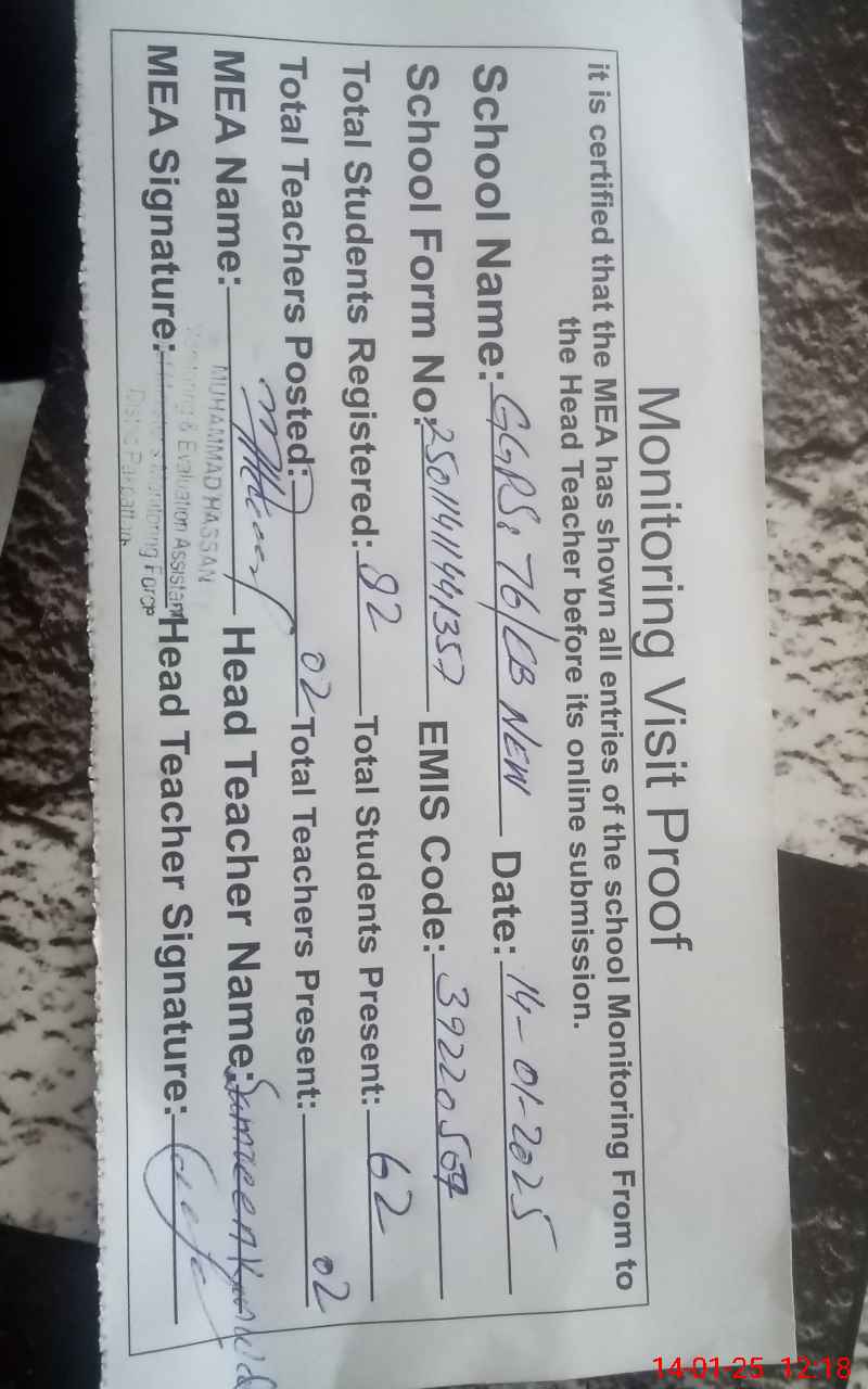 | EMIS Code: 39220507 | Name of School: GGPS CHAK NO. 76/EB (NEW) | |||