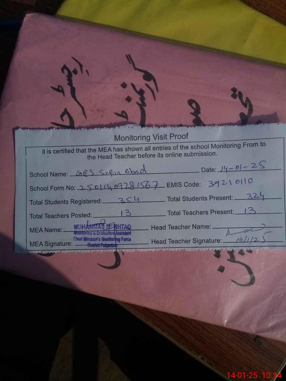 | Certified that this School was Inspected by the Undersigned MEA/DMO Today and the Information Stated Above is as Per Record. | |||||
