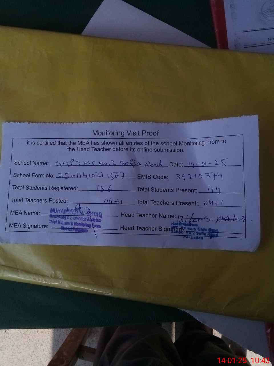 | Attendance Register | Head Teacher | MEA with School | Visit Proof |