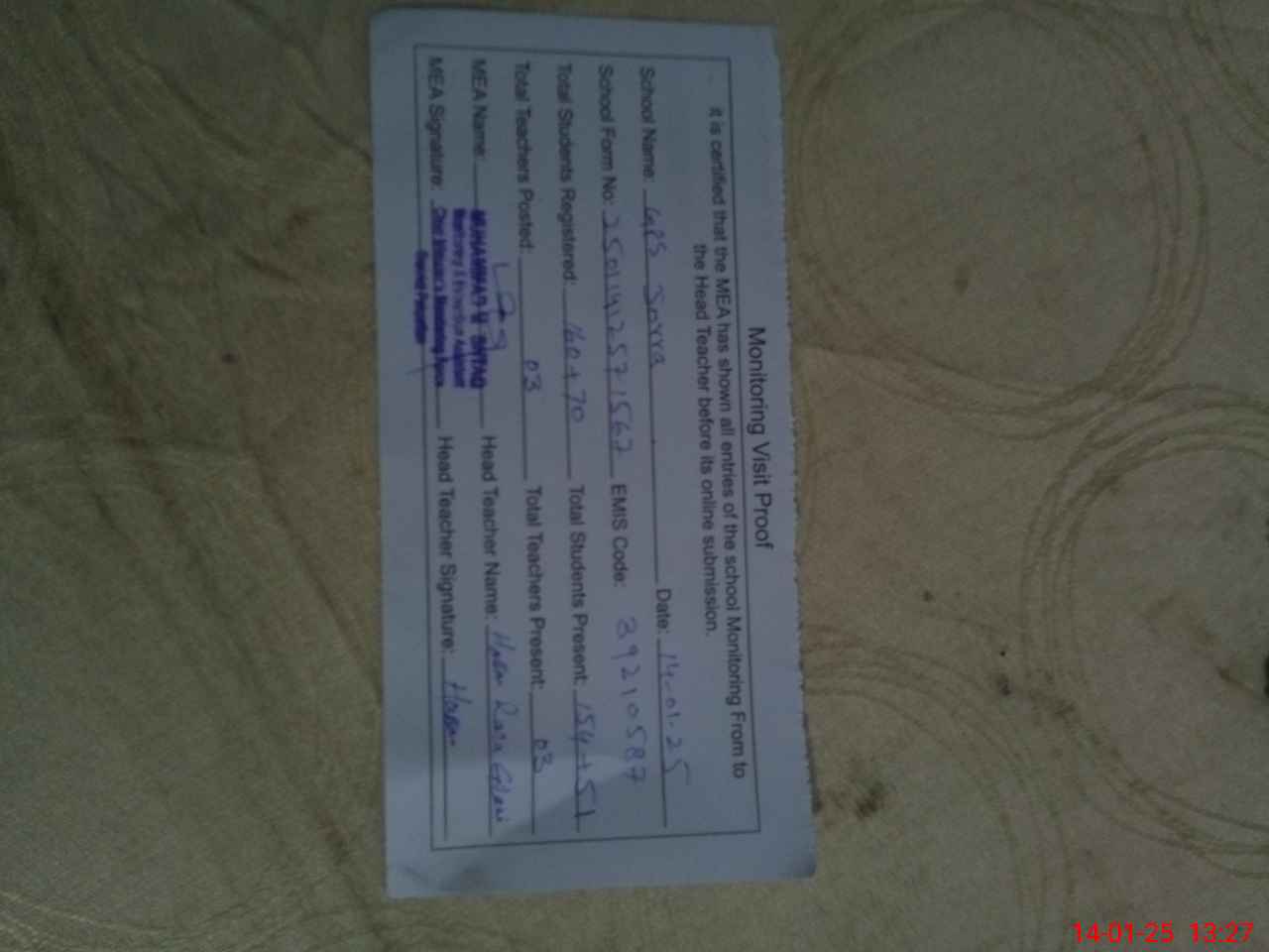 | Attendance Register | Head Teacher | MEA with School | Visit Proof |