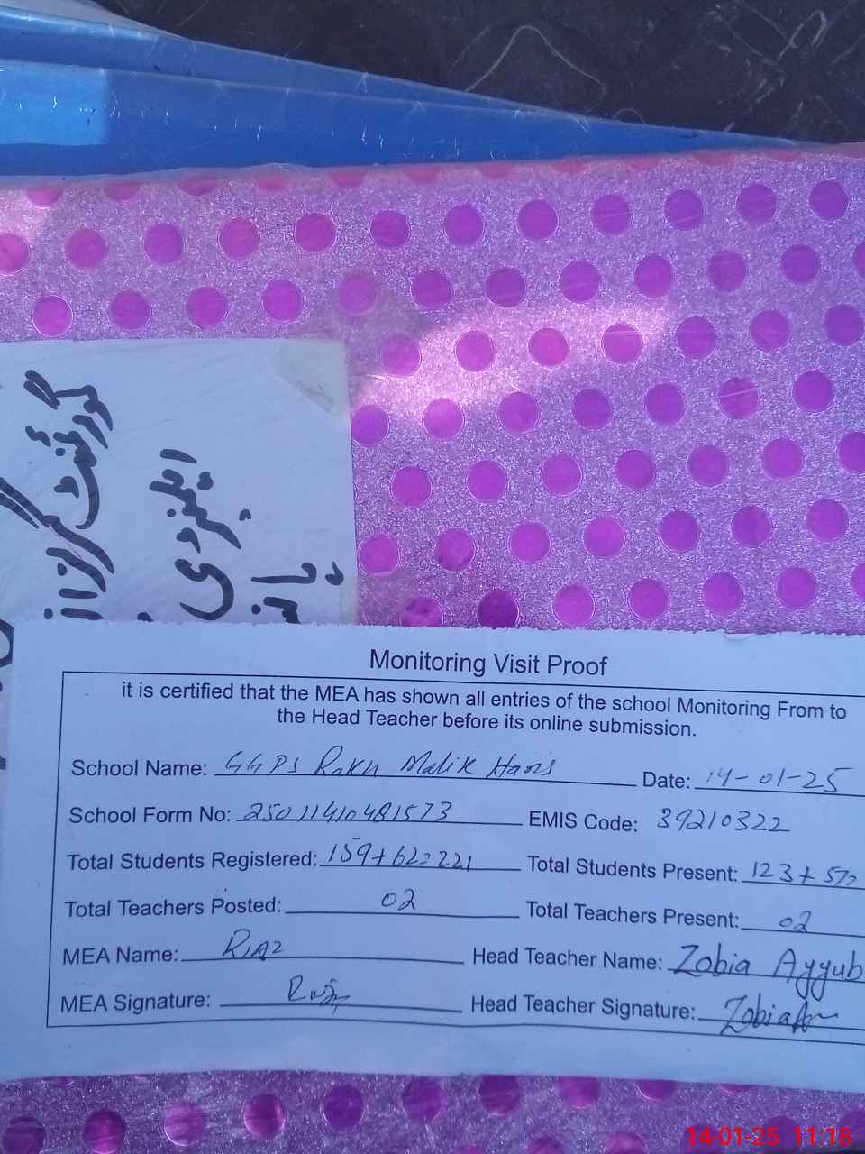 | Certified that this School was Inspected by the Undersigned MEA/DMO Today and the Information Stated Above is as Per Record. | |||||
