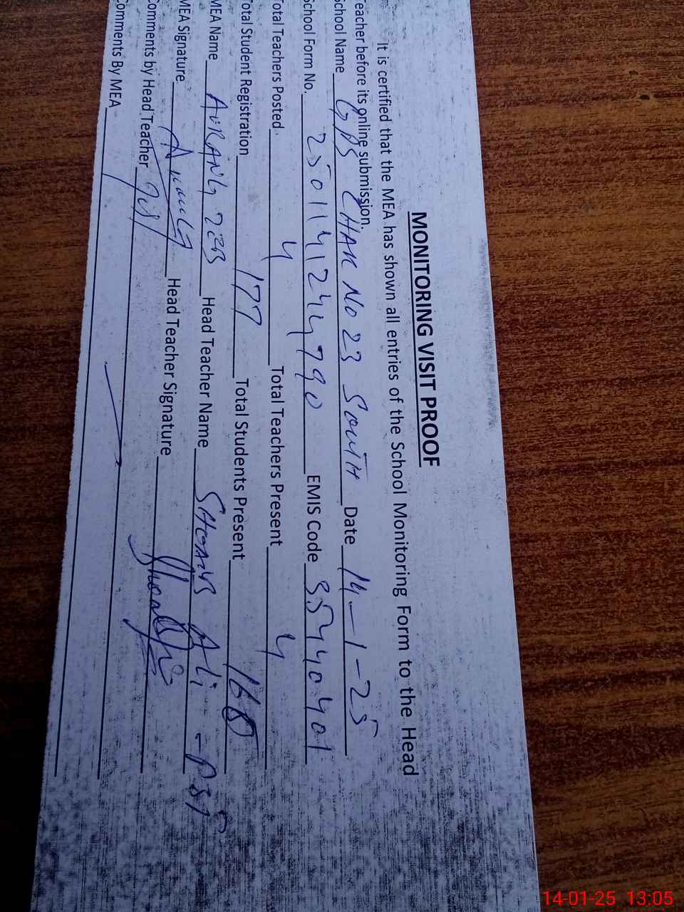 | Attendance Register | Head Teacher | MEA with School | Visit Proof |