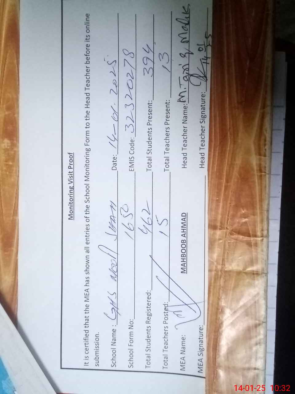 | Attendance Register | Head Teacher | MEA with School | Visit Proof |