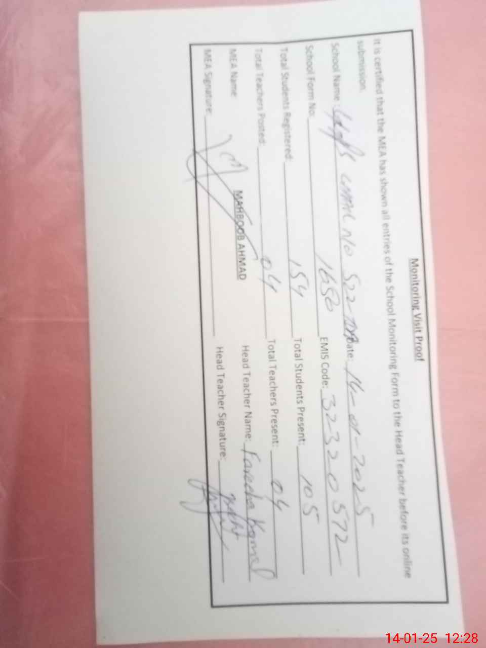 | Attendance Register | Head Teacher | MEA with School | Visit Proof |