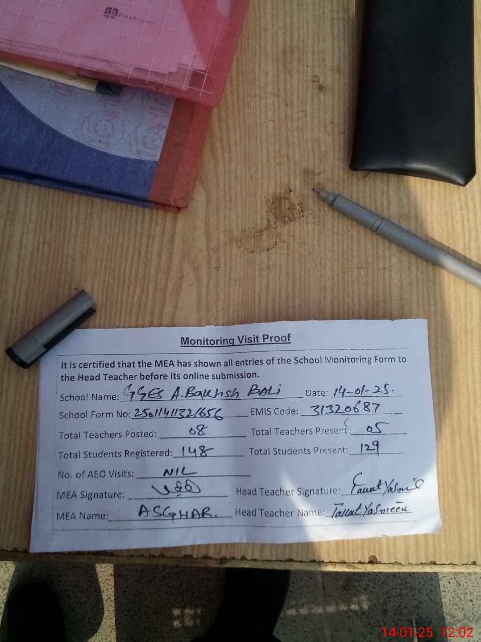 | Attendance Register | Head Teacher | MEA with School | Visit Proof |