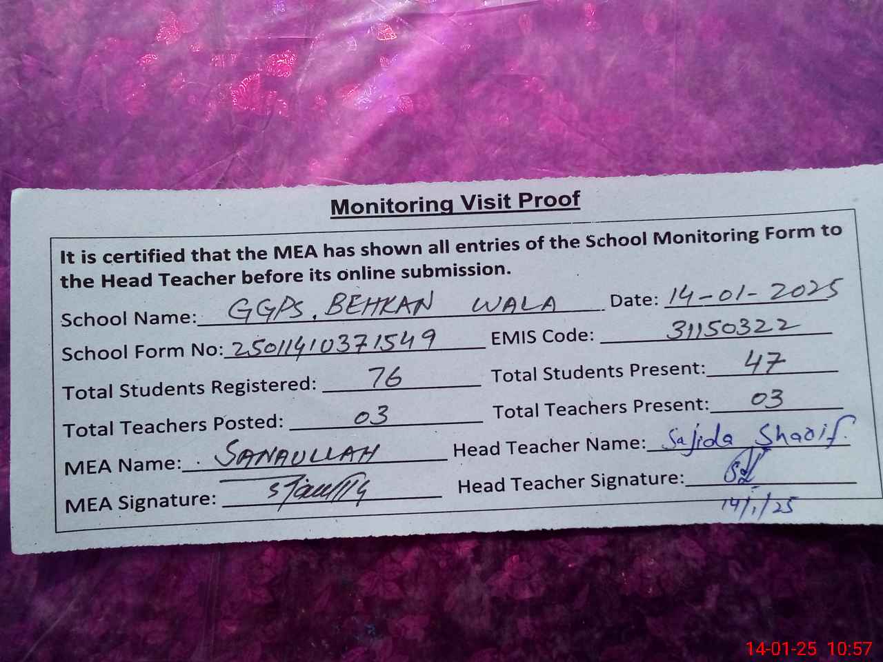 | EMIS Code: 31150322 | Name of School: GGPS BEHKAN WALA | |||