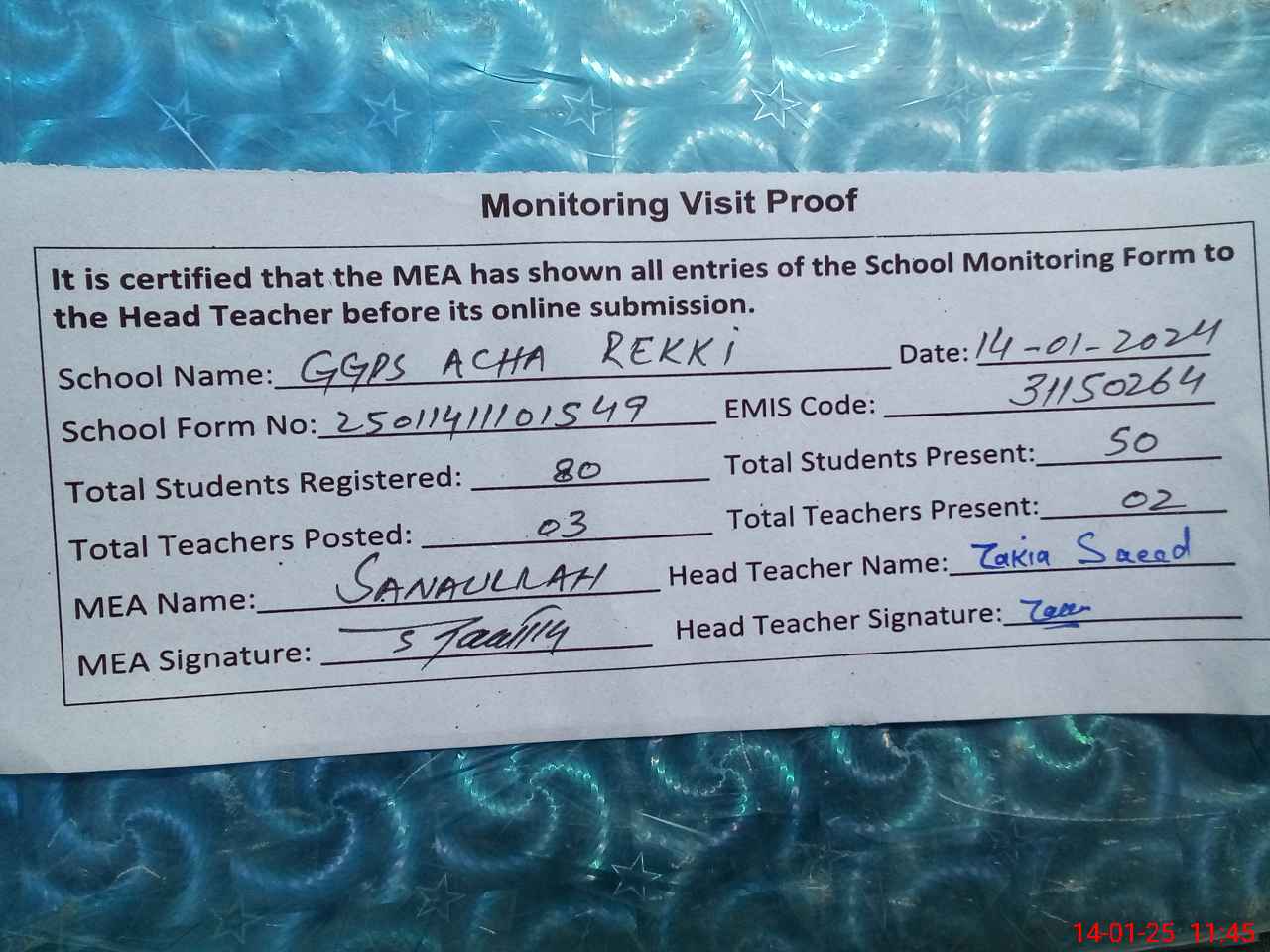 | Attendance Register | Head Teacher | MEA with School | Visit Proof |