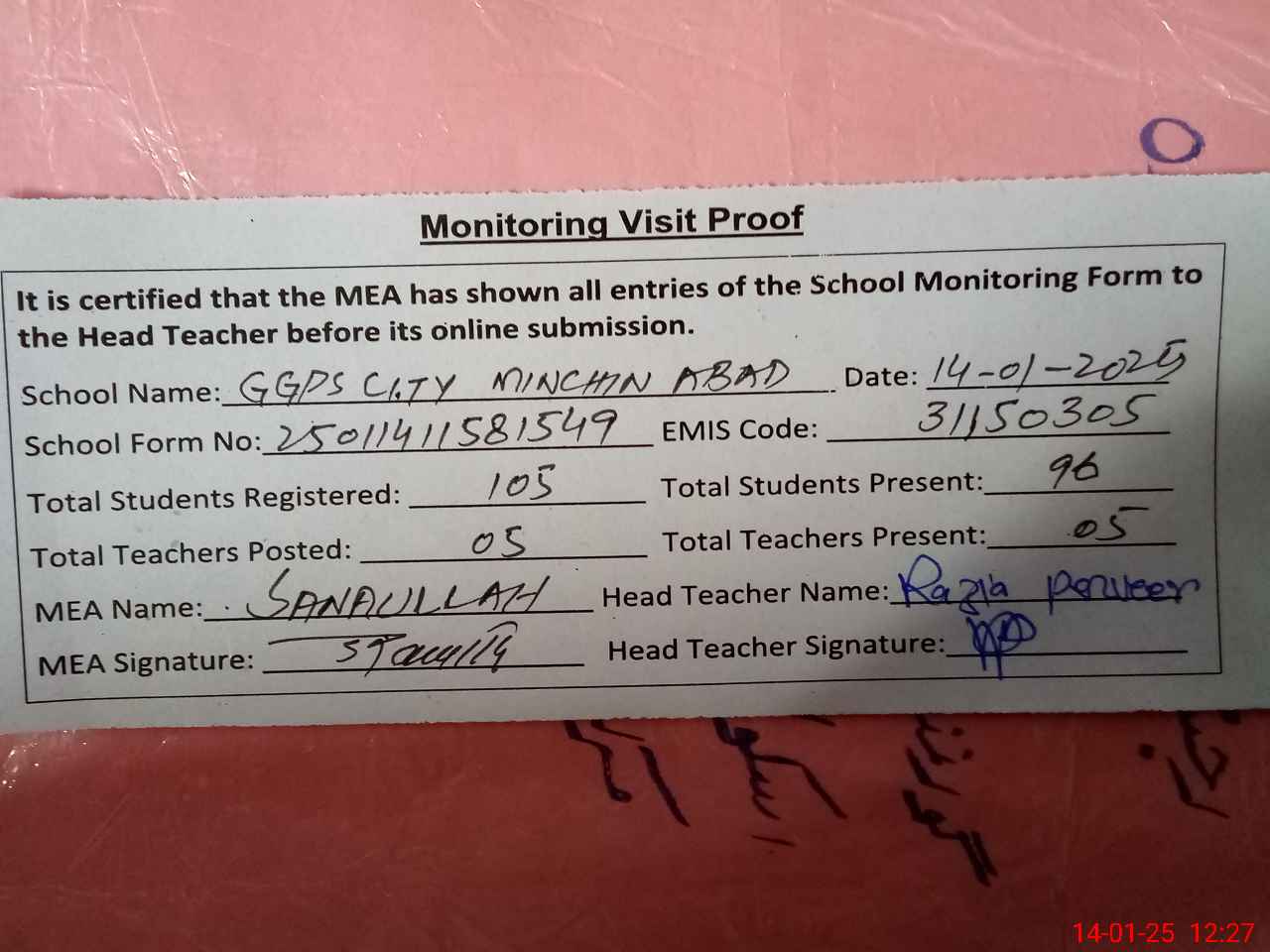| EMIS Code: 31150305 | Name of School: GGPS CITY MINCHIN ABAD | |||