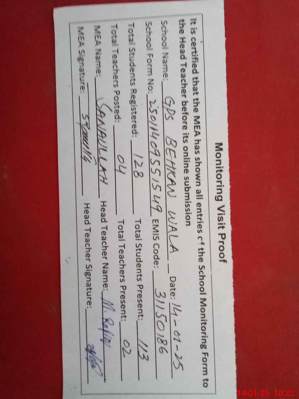 | EMIS Code: 31150186 | Name of School: GPS BEHKAN WALA | |||
