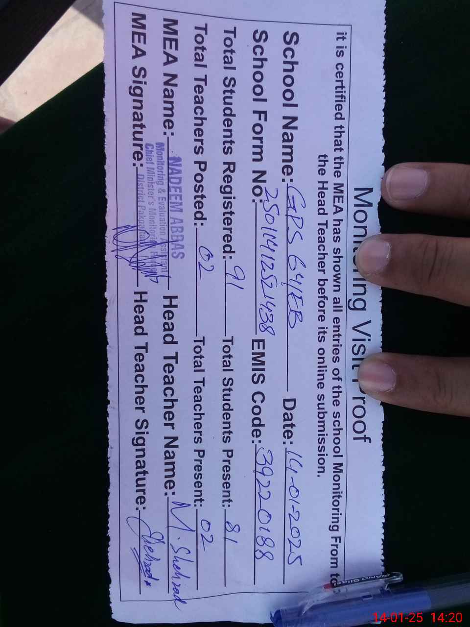 | EMIS Code: 39220188 | Name of School: GPS 64 EB ARIFWALA | |||