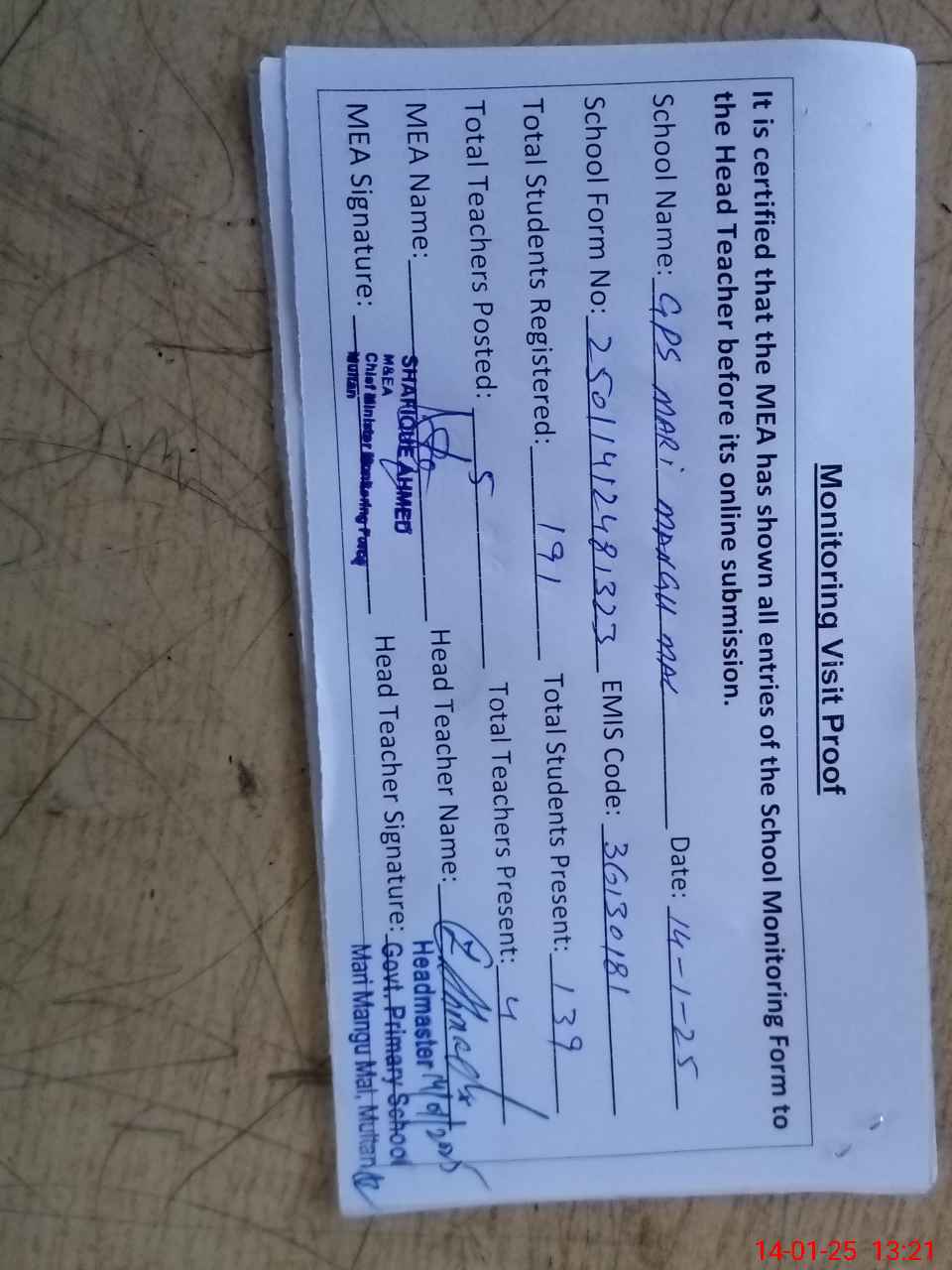 | Attendance Register | Head Teacher | MEA with School | Visit Proof |