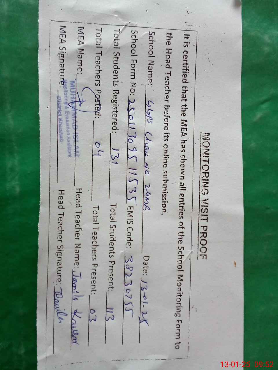 | Attendance Register | Head Teacher | MEA with School | Visit Proof |