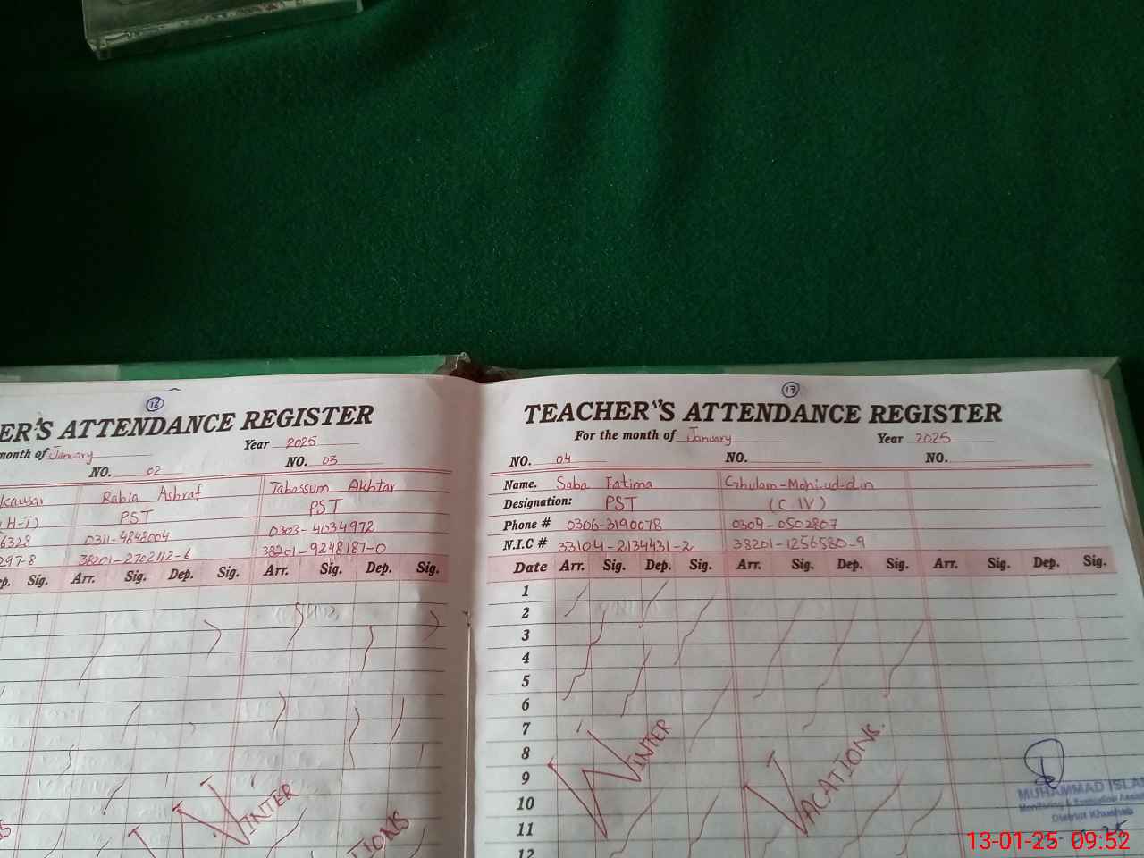 | CNIC | Full Name | Designation | R/C | Absence During Last Calender Month |