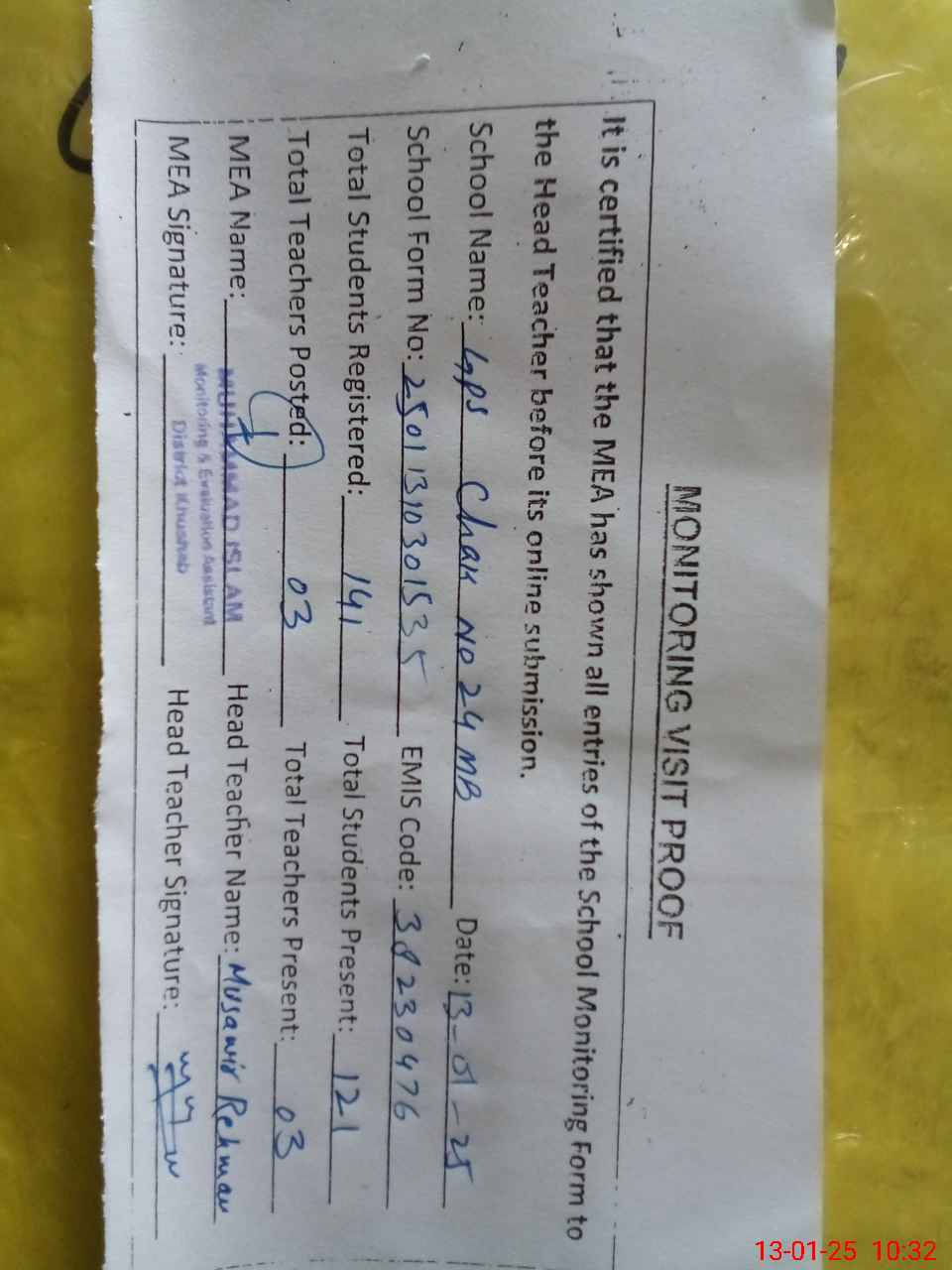| EMIS Code: 38230476 | Name of School: GPS CHAK NO. 24 MB | |||