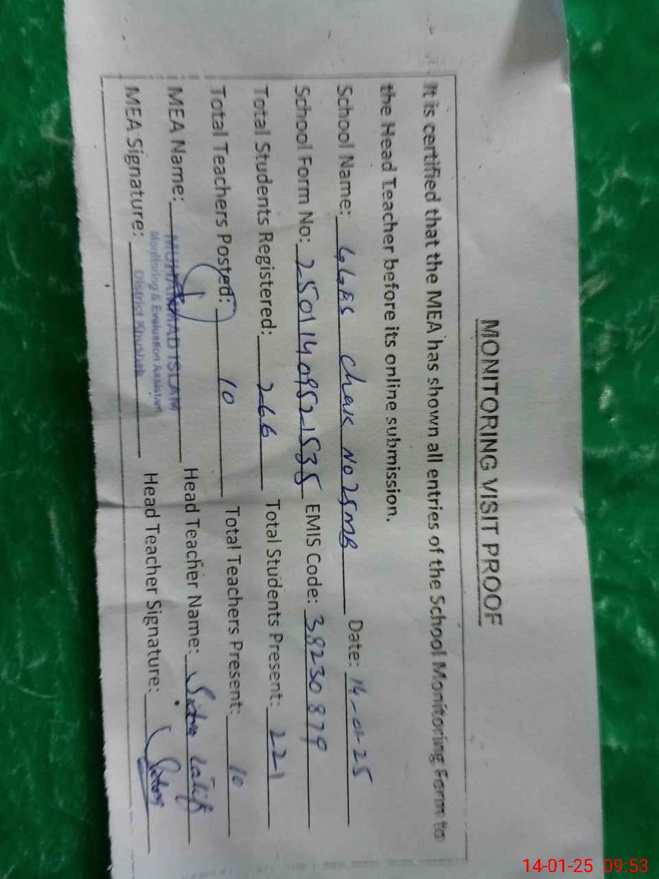 | Attendance Register | Head Teacher | MEA with School | Visit Proof |