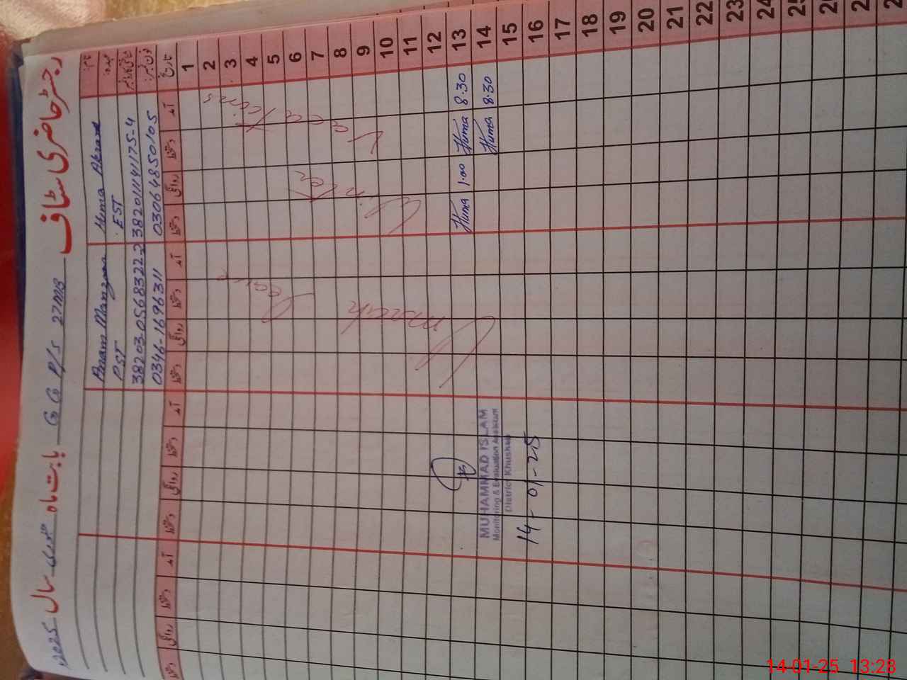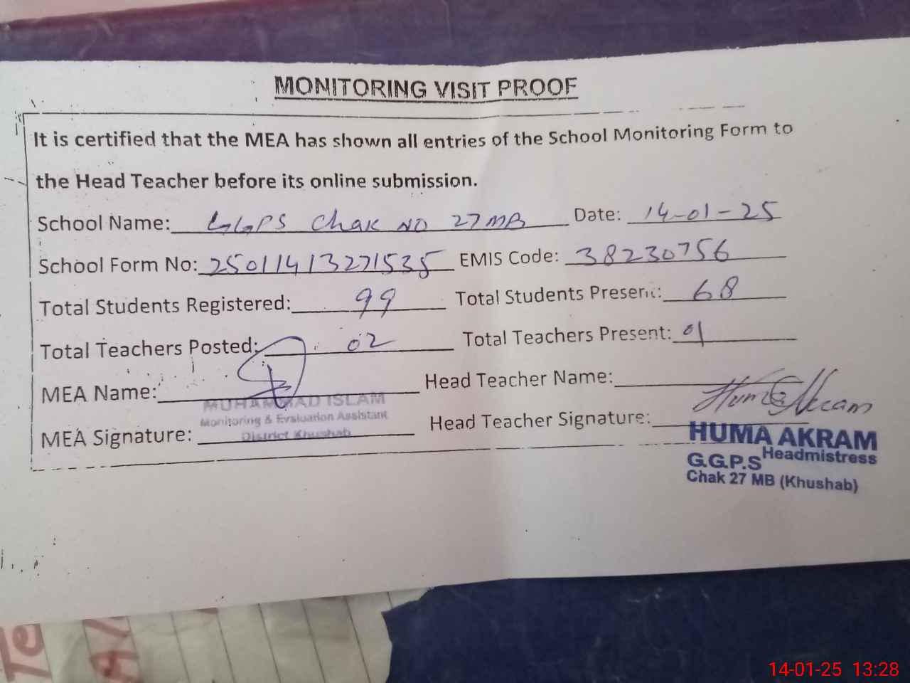 | Attendance Register | Head Teacher | MEA with School | Visit Proof |