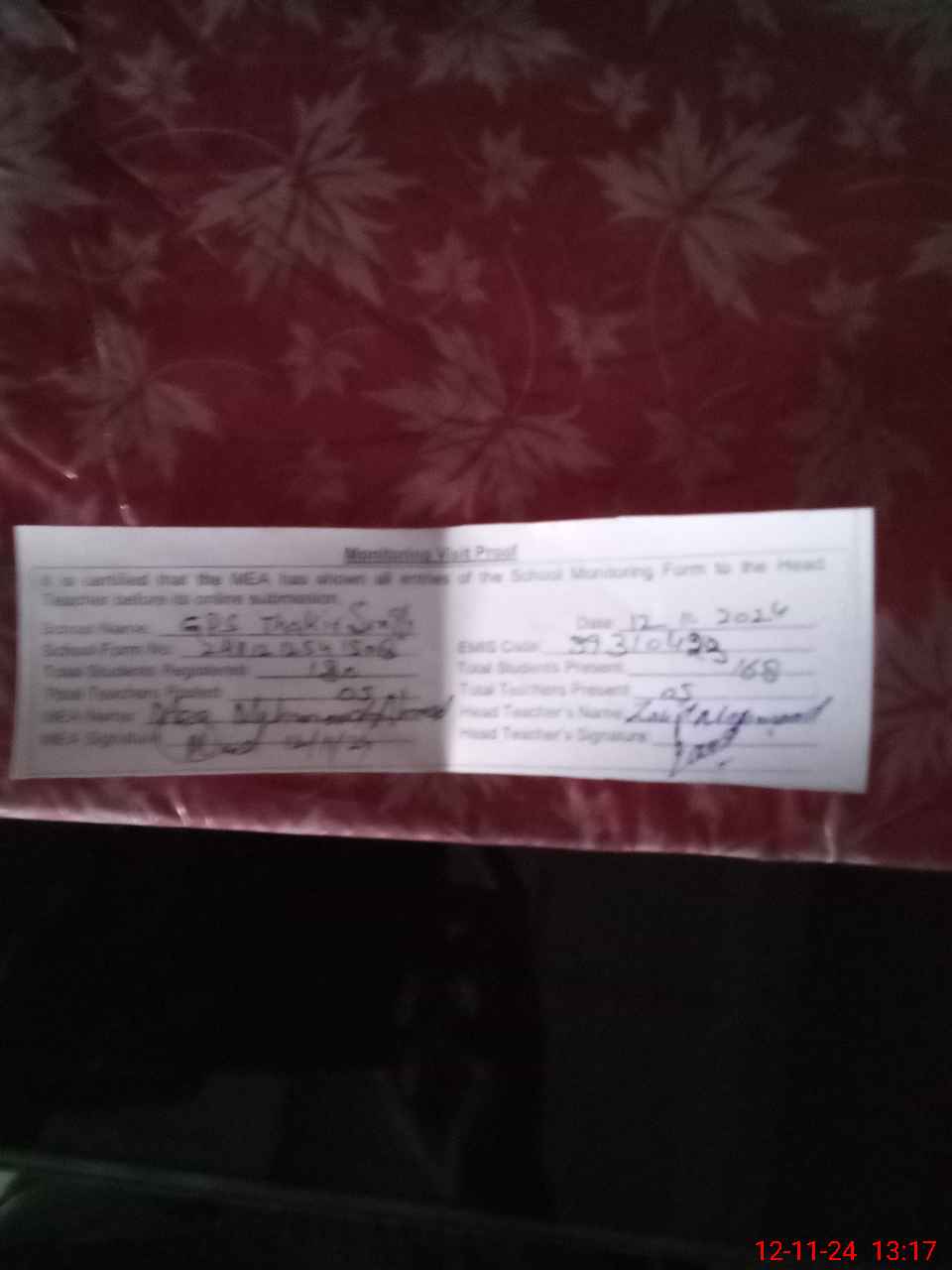 | Attendance Register | Head Teacher | MEA with School | Visit Proof |
