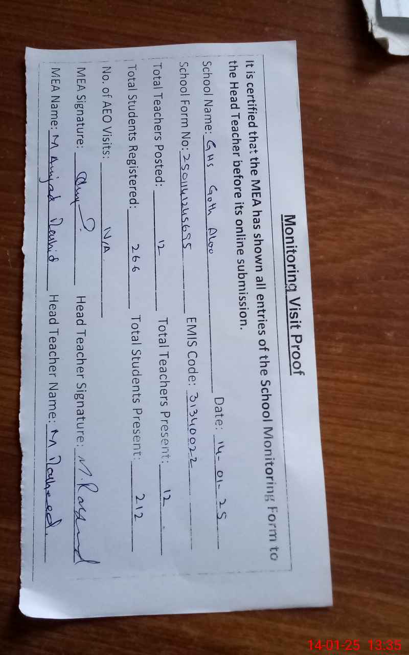 | EMIS Code: 31340022 | Name of School: GHS GOTH ALOO | |||