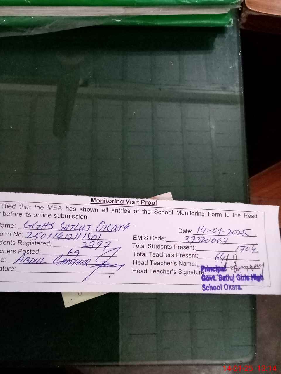 | Attendance Register | Head Teacher | MEA with School | Visit Proof |