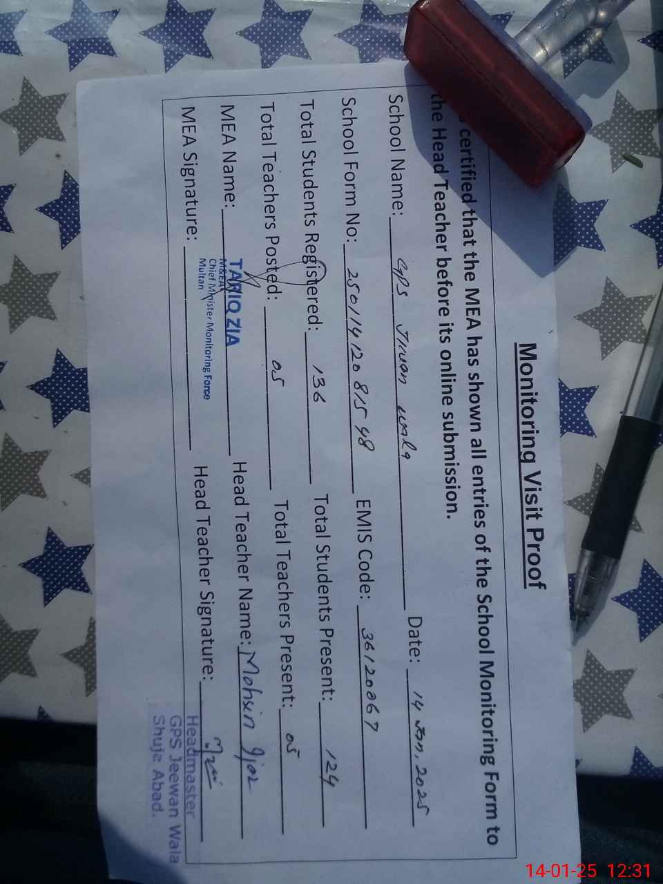 | Attendance Register | Head Teacher | MEA with School | Visit Proof |