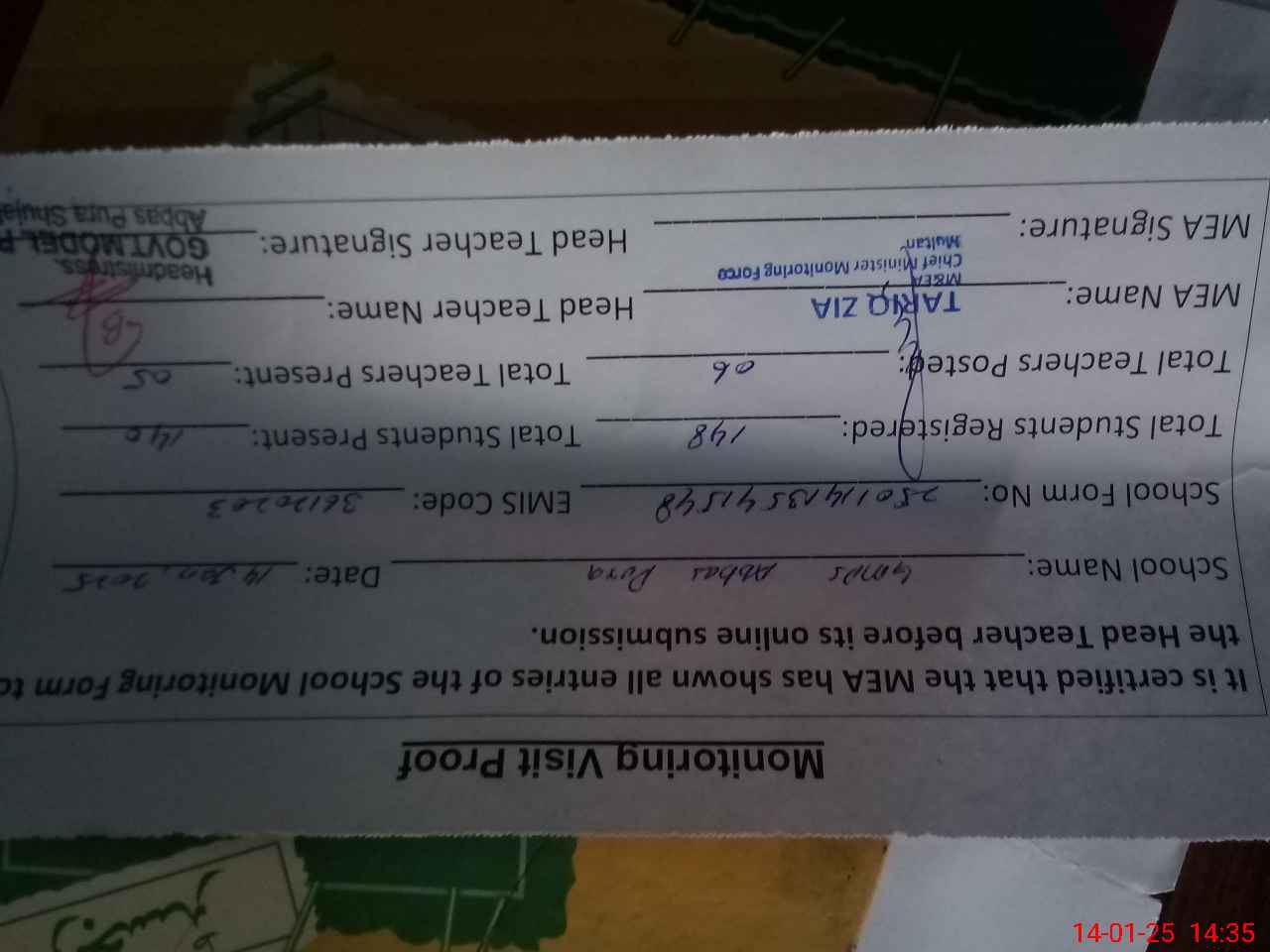 | Attendance Register | Head Teacher | MEA with School | Visit Proof |