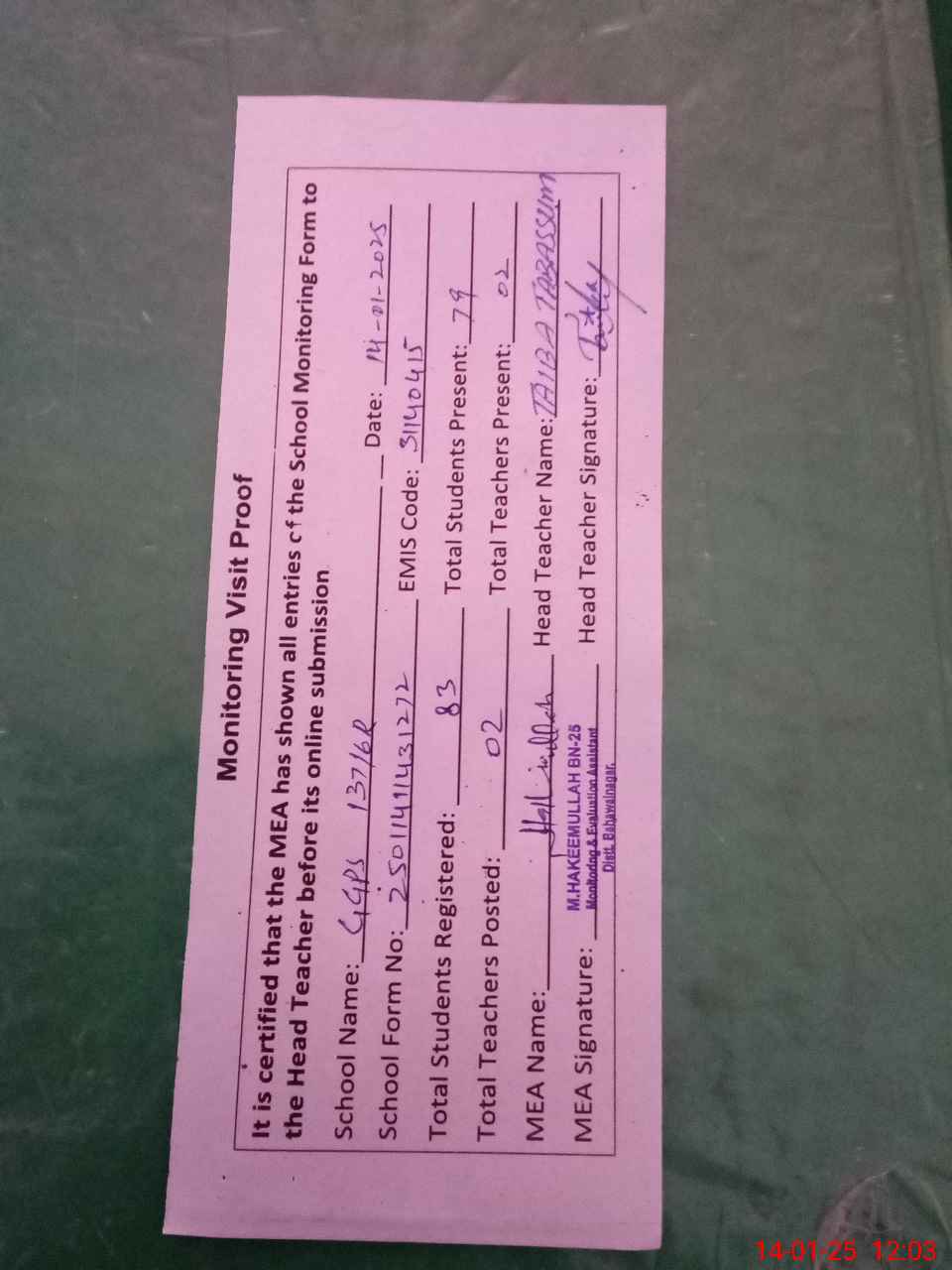 | Attendance Register | Head Teacher | MEA with School | Visit Proof |