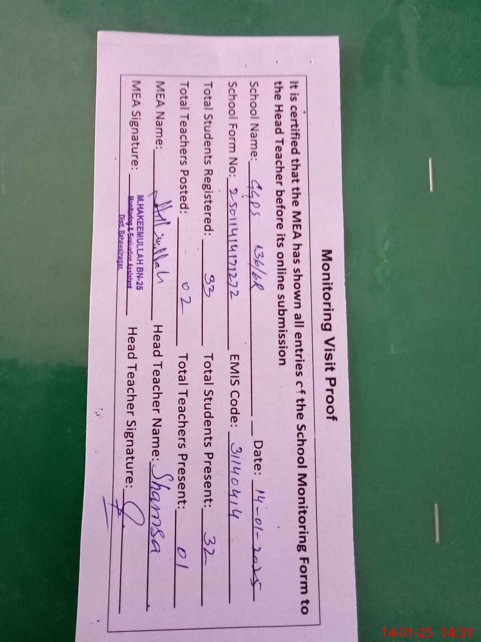 | Attendance Register | Head Teacher | MEA with School | Visit Proof |