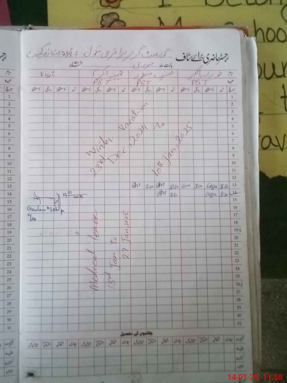 | Total no. of Classrooms: 2 No. of Classrooms Used for Teaching: 2 No. of Classrooms Storing Old Furniture, FTBs, etc: 0Comments if Any: Nominal roll for online attendance found contrary to current students records All enrolled students provided with free taxtbooks accordingly |