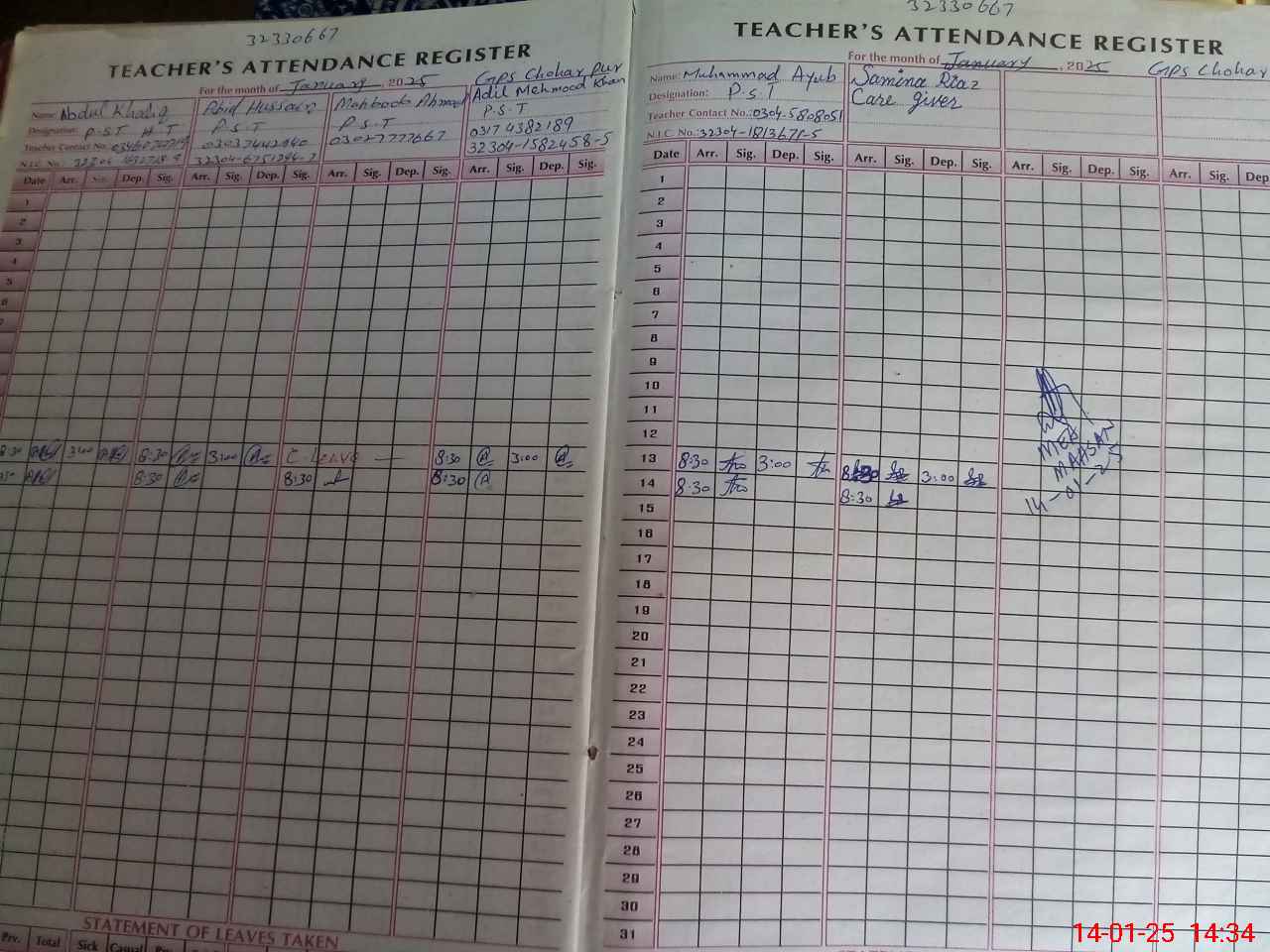 | Name: AB**** KH**** Designation: (School Headmaster's/Headmistress's) PST/PTC/JV Phone/Cell Number: 03**** |