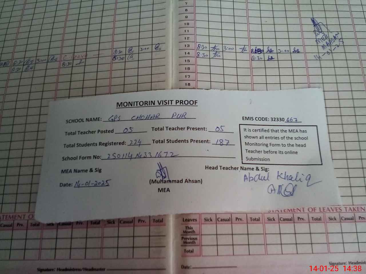 | Attendance Register | Head Teacher | MEA with School | Visit Proof |