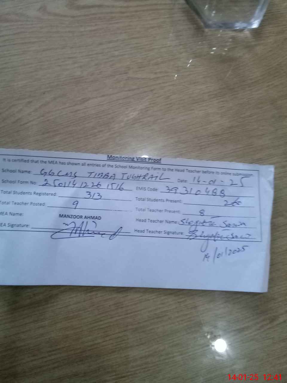 | Attendance Register | Head Teacher | MEA with School | Visit Proof |