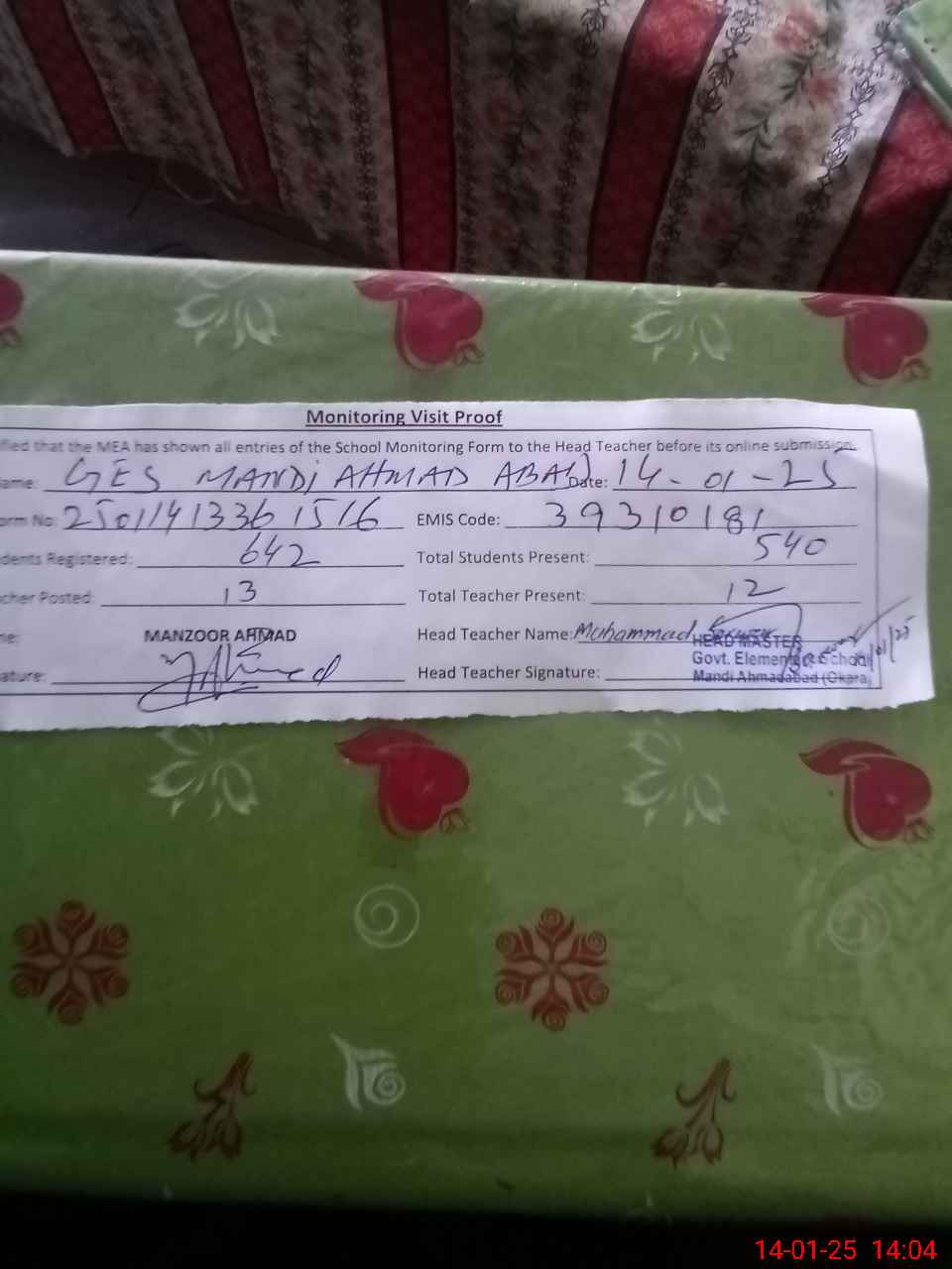 | Attendance Register | Head Teacher | MEA with School | Visit Proof |
