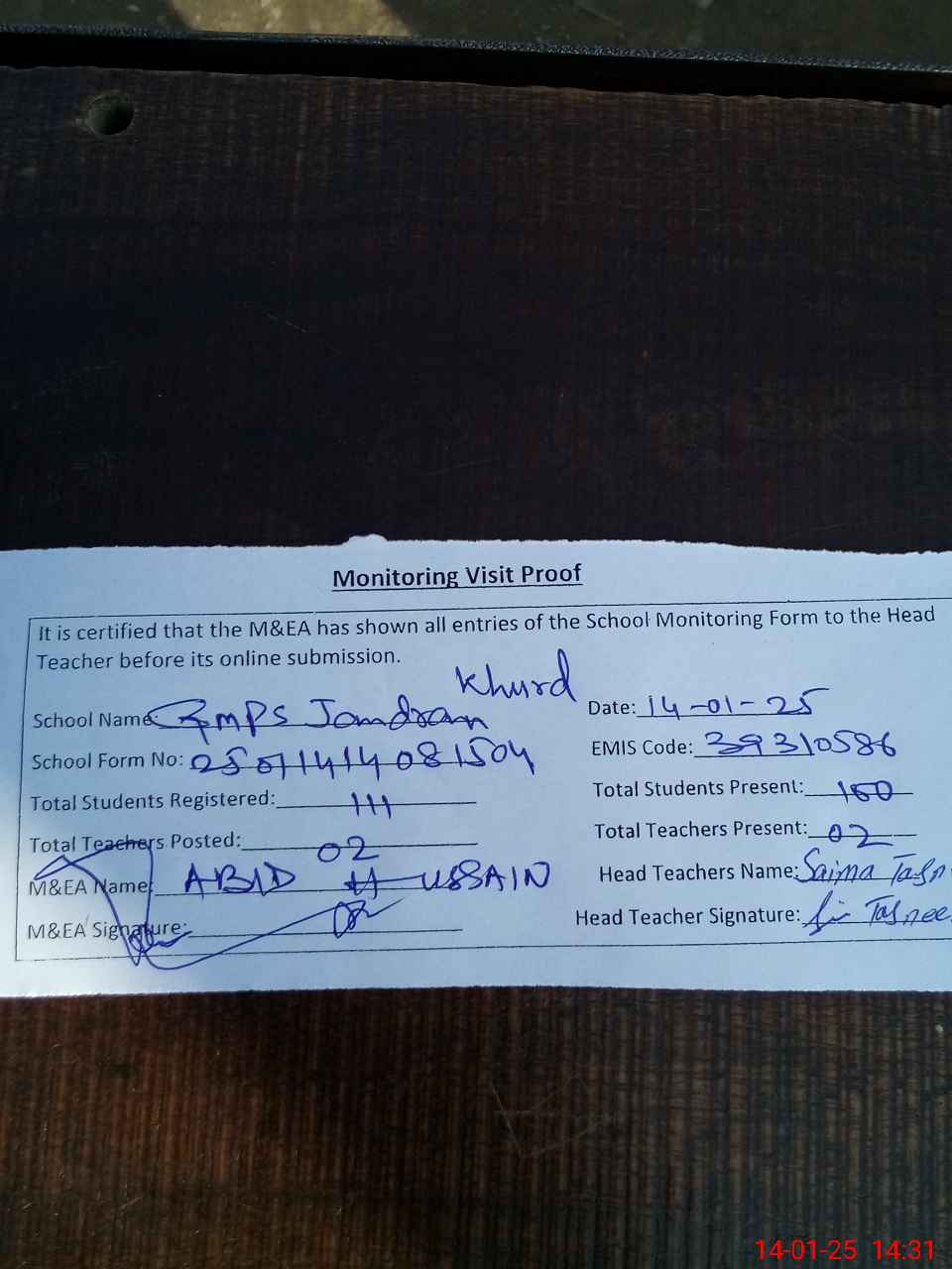 | Attendance Register | Head Teacher | MEA with School | Visit Proof |